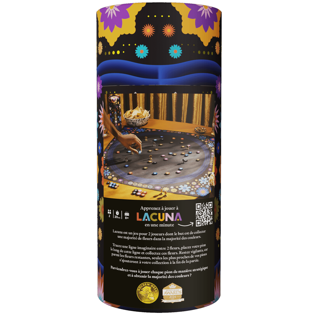 Lacuna est un jeu à deux tout en douceur, où vous collectez des fleurs posées sur un étang nocturne. Tracez une ligne imaginaire entre deux fleurs, placez votre pion… et récupérez-les toutes les deux. Simple, épuré et profondément stratégique, Lacuna transforme chaque tour en un petit moment suspendu.