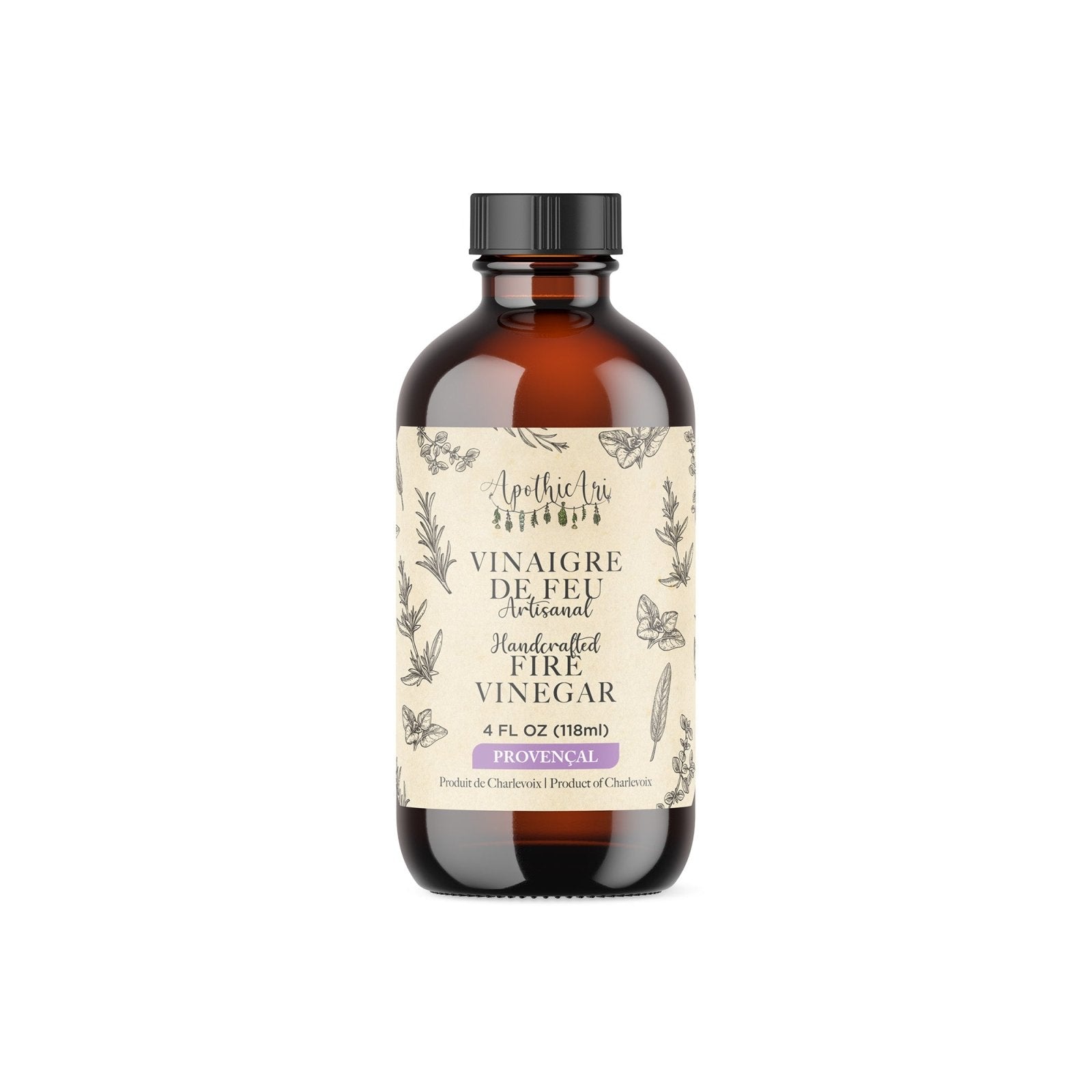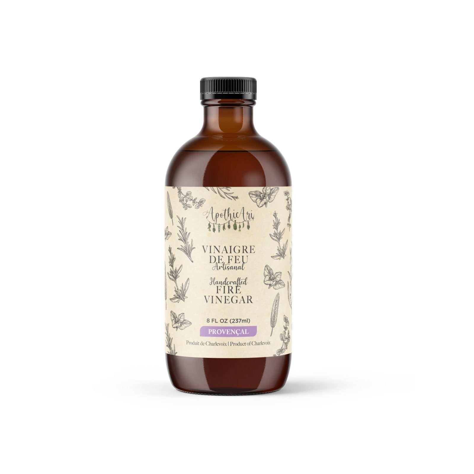 Le Vinaigre de Feu Provençal ApothicAri est un vinaigre de cidre de pomme biologique non pasteurisé dans lequel macèrent plusieurs semaines nos ingrédients de base — oignon, ail, raifort, gingembre et curcuma — auxquels s’ajoute un bouquet d’herbes qui évoquent le sud de la France : estragon, sarriette, romarin, thym et une délicate touche de lavande.